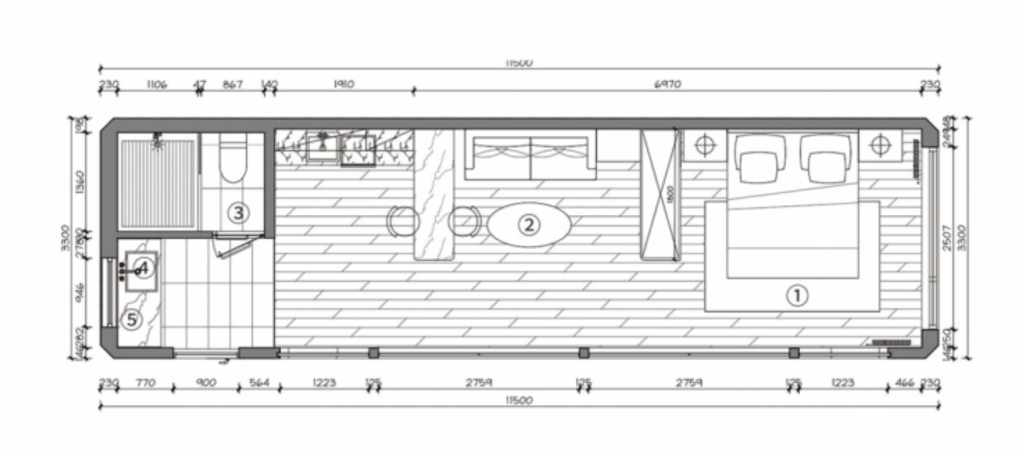 | 11500mm*3300mm*3300mm | 38 sqm | 2-4 people | 9.9KW | 9 tons |
